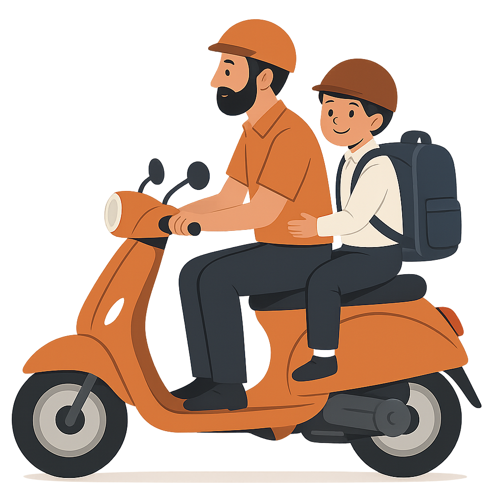 Every ride is dedicated to just one student — giving them focused attention, secure seating, and predictable routines. Our drivers always wear helmets as part of our commitment to road safety. While child helmets are not mandatory today, we’re actively working to introduce them soon — because every small precaution adds up to big peace of mind.